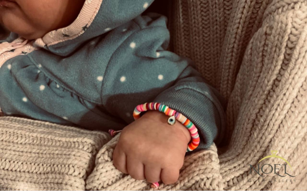 برخی مدل‌ها با ترکیب طلا و صدف یا سنگ‌های رنگی طراحی می‌شوند. صدف‌های سفید یا صورتی ظاهری لطیف و کودکانه دارند و در کنار طلای زرد جلوه‌ای خاص ایجاد می‌کنند. این مدل‌ها به‌ویژه برای مراسم خاص مثل جشن تولد یا نوروز گزینه‌ای محبوب هستند. در نو ال گلد گالری، از صدف‌های طبیعی و سنگ‌های سبک استفاده می‌شود تا دستبند همچنان راحت و ضدحساسیت باشد.