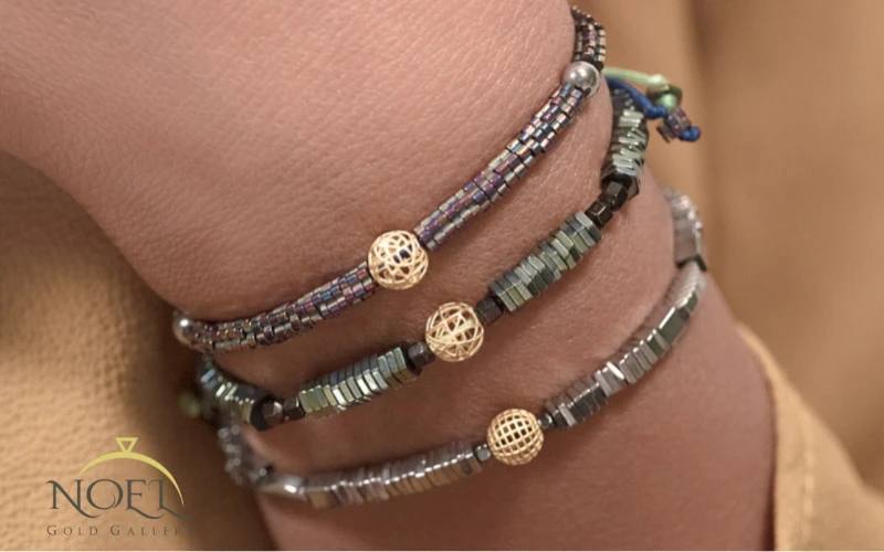 برای کسانی که میخواهند کمی تنوع به استایل مینیمال خود بدهند، دستبندهایی با یک سنگ رنگی یا مروارید کوچک بهترین گزینه هستند. این مدلها همچنان ساده و ظریفاند اما یک نقطه کانونی جذاب روی دست ایجاد میکنند. ترکیب مروارید یا سنگ تولد با طلای ۱۸ عیار، زیبایی و اصالت را در کنار هم به نمایش میگذارد.