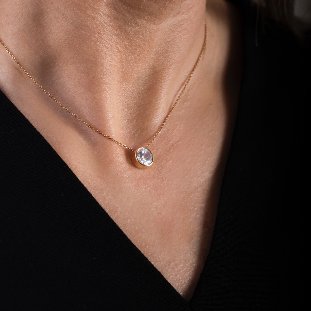 این گردنبند طلا به دلیل طراحی ساده و نگین مرکزی، بهراحتی با استایلهای مختلف ست میشود و برای سنین گوناگون مناسب است.