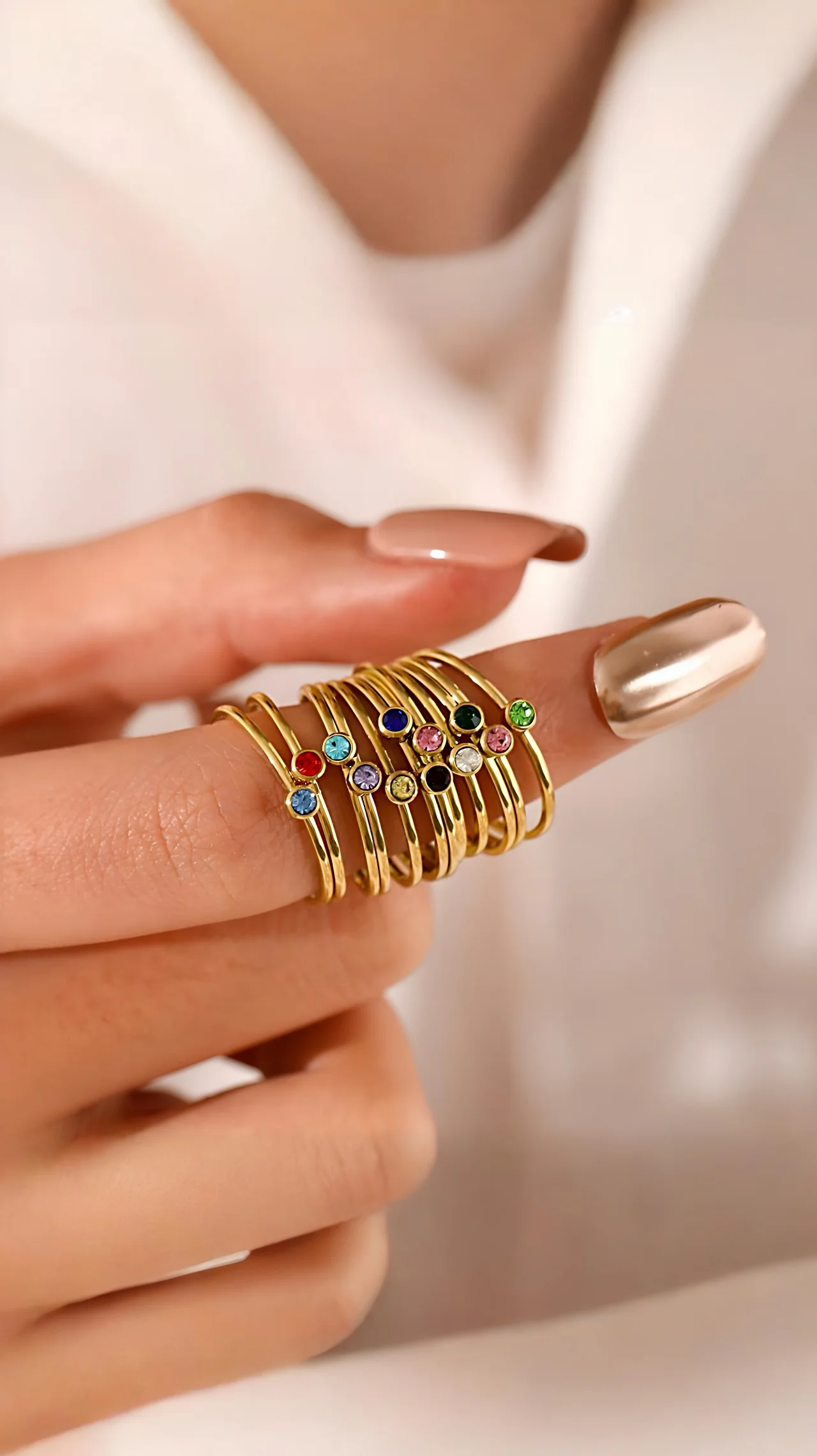 یکی از جذابترین ویژگیهای این انگشتر، تنوع بینظیر رنگ نگینها است که به شما امکان میدهد نگین متناسب با ماه تولد یا سلیقه شخصی خود را انتخاب کنید. این ظرافت در طراحی به گونهای است که میتوان چندین انگشتر را در کنار هم و بر روی یک انگشت استفاده کرد و یک جلوه لایهای و مدرن ایجاد نمود.