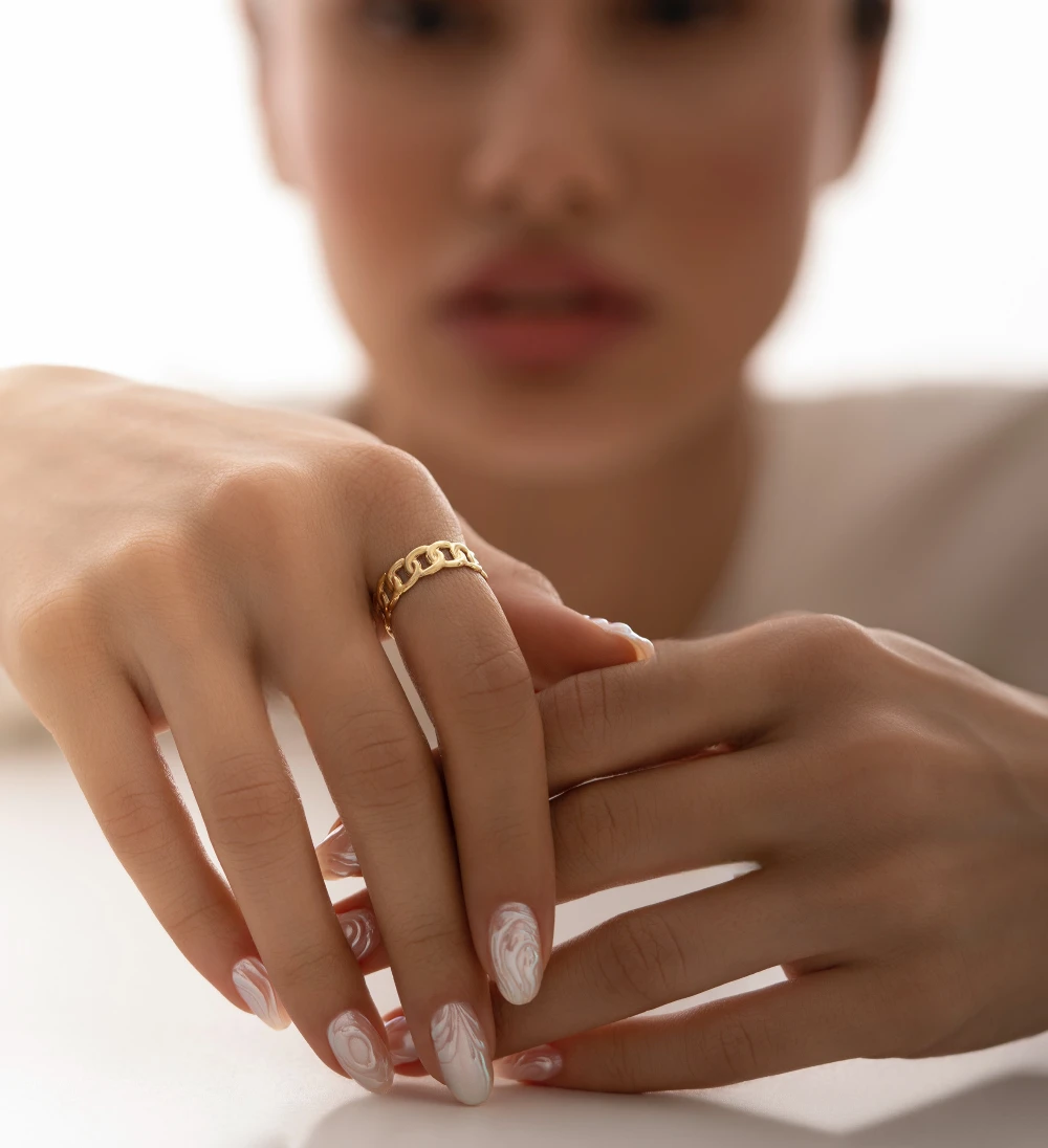 انگشتر کارتیر فیکس کد 100072، یکی از خاصترین انگشترهای طلا در مجموعه نو ال گلد گالری است. این انگشتر طلا زنانه با الهام از طرح زنجیر کارتیر، به صورت کاملاً فیکس و محکم ساخته شده که برخلاف مدلهای زنجیری منعطف، همیشه فرم حلقهای خود را حفظ میکند. این ویژگی، دوام و استحکام آن را تضمین میکند. این انگشتر کارتیر با وجود نمای چشمگیرش، توخالی بوده و وزن سبکی دارد که برای استفاده روزمره بسیار مناسب است.