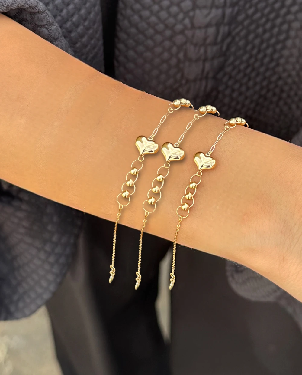 قلب مرکزی این دستبند با فرم دامله و کشیده، جلوهای سهبعدی و چشمنواز دارد که در نگاه اول، حس لطافت و عشق را منتقل میکند. زنجیر ظریف و حلقههای متوالی که با گویهای کوچک طلایی تزئین شدهاند، ترکیبی متعادل میان سادگی و درخشش ایجاد کردهاند تا این دستبند هم برای استفاده روزمره و هم برای موقعیتهای خاص مناسب باشد.یکی از ویژگیهای برجستهی دستبند بلامور، قابلیت تنظیم سایز است؛ بهطوریکه با زنجیر اکستنشن انتهایی میتوان آن را بهراحتی برای هر مچ دستی فیت کرد. این دستبند از طلای ۱۸ عیار خالص ساخته شده است.