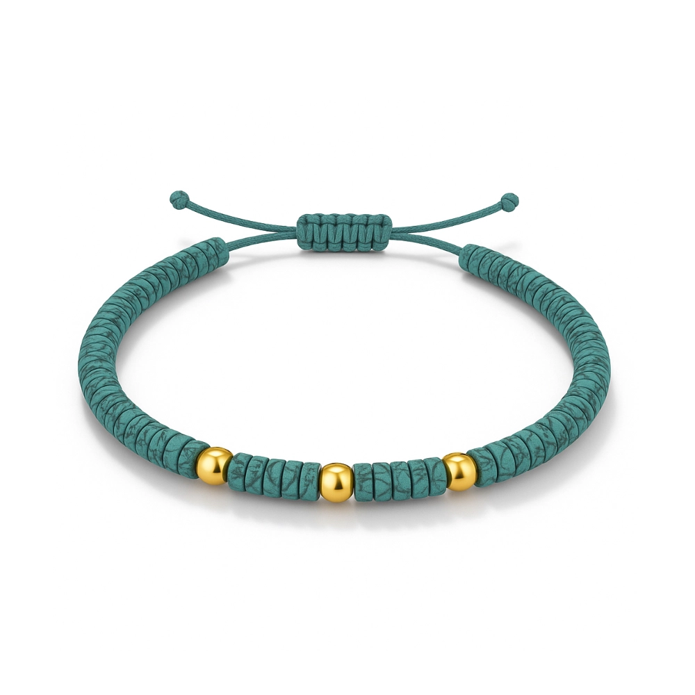 سه گوی طلایی این محصول از طلای ۱۸ عیار اصل ساخته شدهاند گ.در کنار آنها، مهرههای افغان طرح فیروزه قرار دارند که هر کدام دارای رگهها و نقشهای منحصربهفرد هستند. همین ویژگی باعث میشود هیچ دو دستبندی کاملاً شبیه هم نباشد و شما همیشه یک اکسسوری خاص و تک در اختیار داشته باشید.
