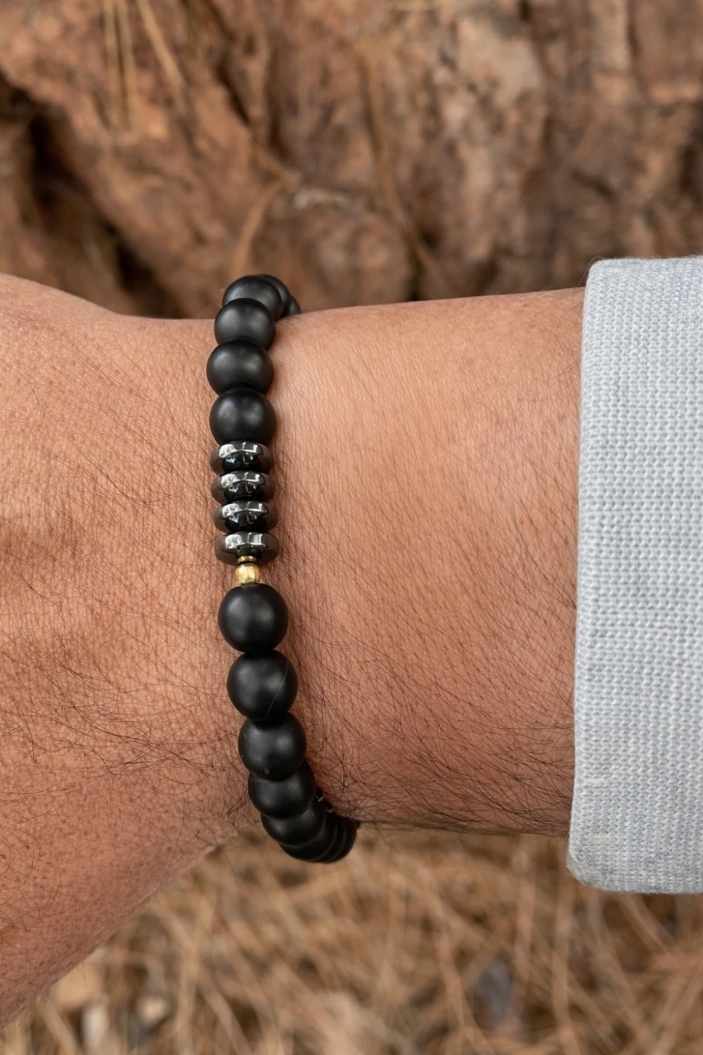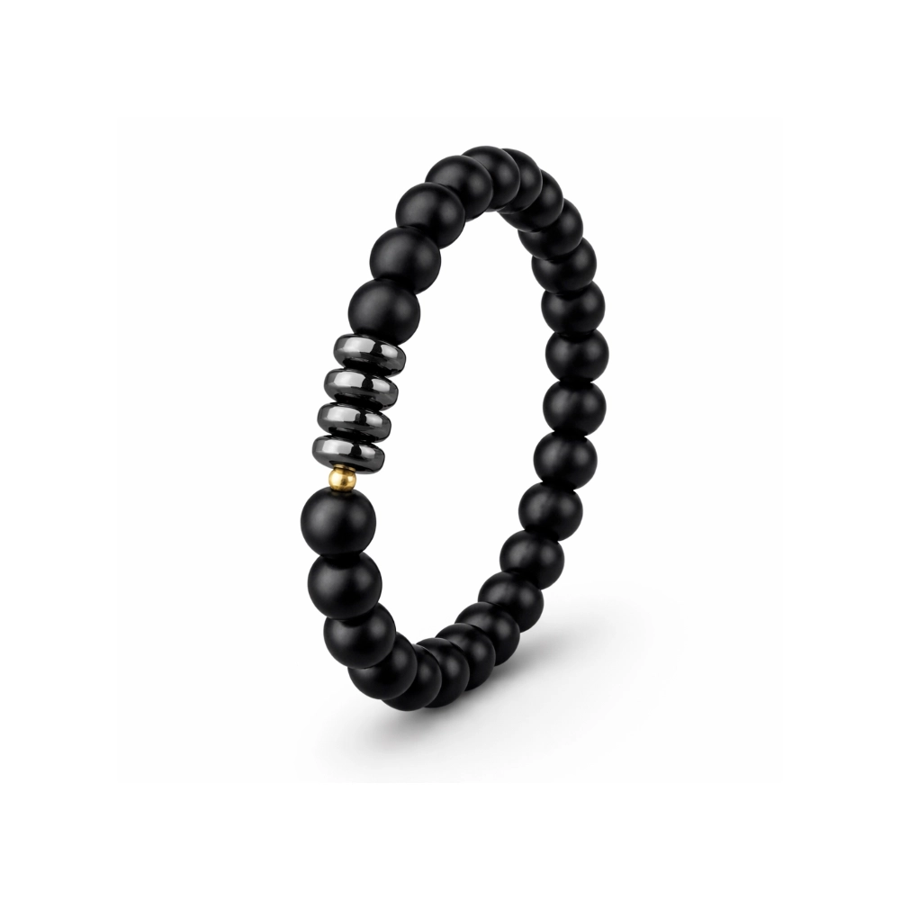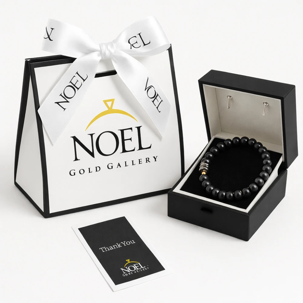 این دستبند مردانه با ترکیبی چشمنواز از مهرههای اونیکس مشکی مات و مهرههای ترکیبی اونیکس و سنگ حدید طراحی شده است؛ ترکیبی که در عین سادگی، جلوهای قدرتمند و مردانه به استایل میبخشد.