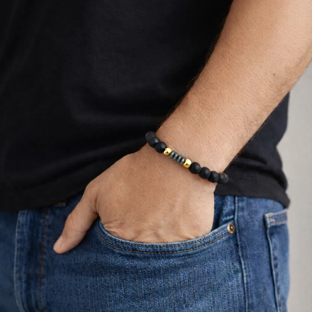 مهرههای اونیکس مشکی: که نماد قدرت، ثبات و تمرکز هستند و ظاهری شیک و رسمی به دستبند میبخشند.