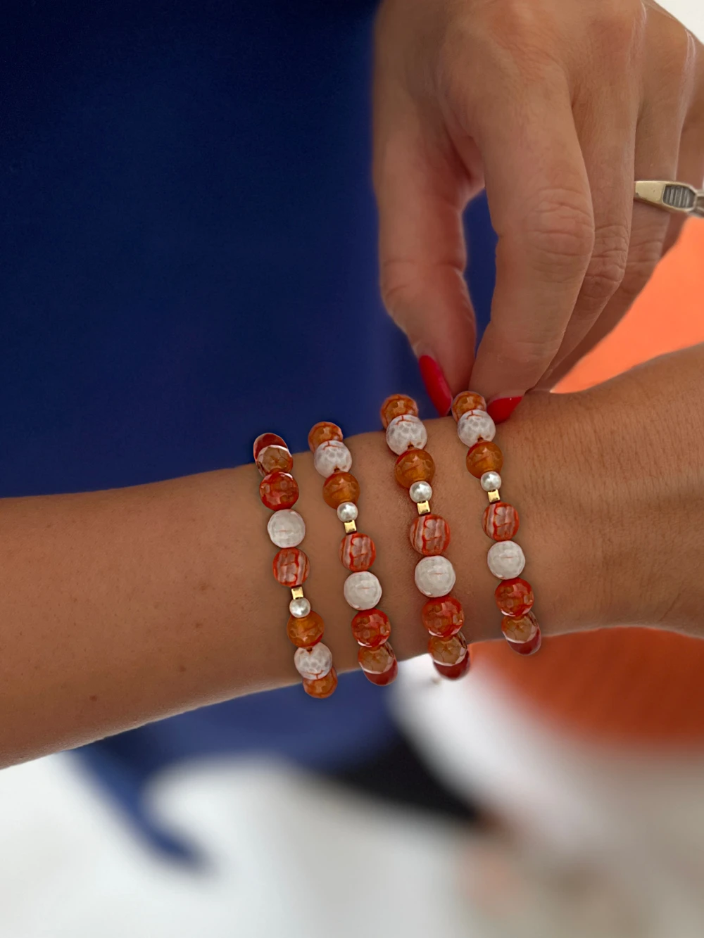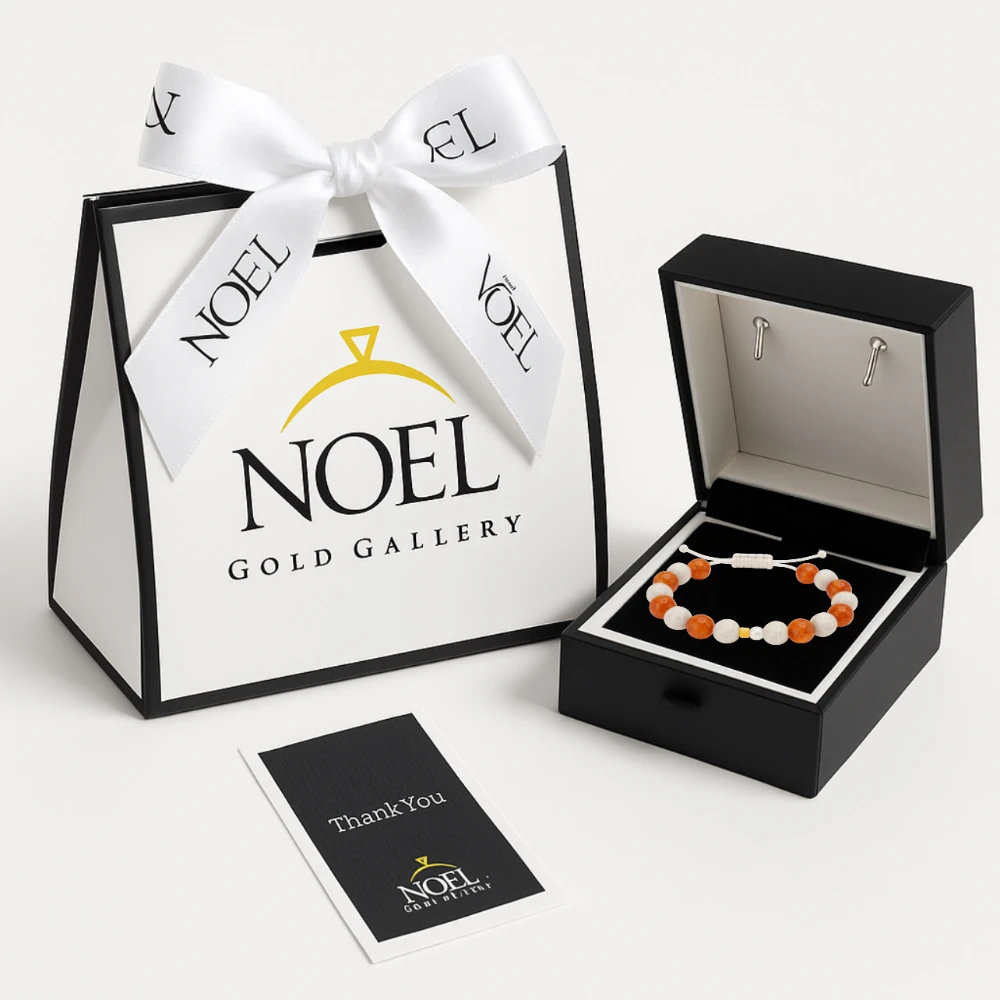 ترکیبی چشمنواز از سنگهای طبیعی و جزئیات مینیمال طلایی است. در طراحی این دستبند، سنگ کارنیلیان (Carnelian) با رنگ نارنجی درخشان در کنار سنگ هولایت (Howlite) با رنگ سفید ملایم قرار گرفته تا تعادلی زیبا میان انرژی و آرامش ایجاد کند. در مرکز این ترکیب، یک مکعب طلای ۱۸ عیار همراه با یک مروارید سفید ظرافتی لوکس و در عین حال ساده به طراحی بخشیده است.بند این دستبند از نوع کشویی قابل تنظیم است و به راحتی با هر سایز مچ دست هماهنگ میشود؛ بنابراین برای استفاده روزمره یا هدیه دادن انتخابی ایدهآل است. سنگ کارنیلیان نماد انرژی، انگیزه و اعتمادبهنفس است و هولایت به عنوان سنگی آرامشبخش، حس تعادل و تمرکز ذهنی را تقویت میکند. ترکیب این دو سنگ در کنار طلا و مروارید، جلوهای طبیعی و در عین حال لوکس به دست میدهد.