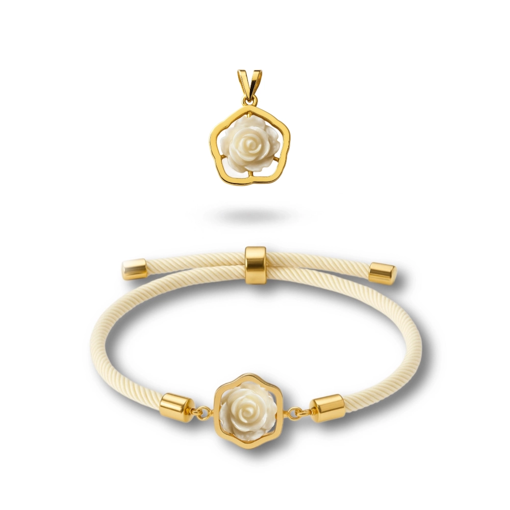 نیمست گردنبند و دستبند گل رز صدفی کد 100129