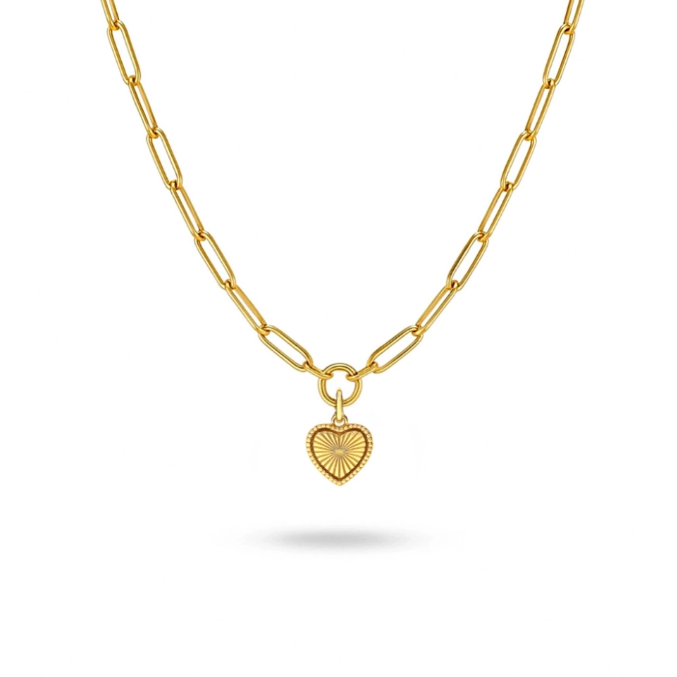 زنجیر این گردنبند از نوع هرمس انتخاب شده است. زنجیرهای هرمس به دلیل ساختار مستطیلی و یکدست خود، ظاهری مدرن و شیک دارند و به راحتی با انواع استایلهای کژوال یا رسمی هماهنگ میشوند. طول زنجیر ۴۰ سانتیمتر است که اندازهای استاندارد و بسیار محبوب در میان بانوان به شمار میرود و به خوبی روی خط گردن قرار میگیرد. این طراحی به گونهای است که پلاک قلب در مرکز توجه قرار گرفته و جلوه بیشتری پیدا میکند.