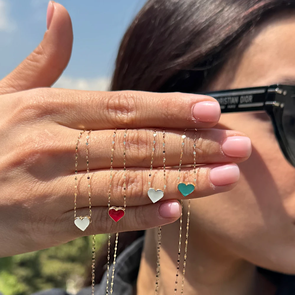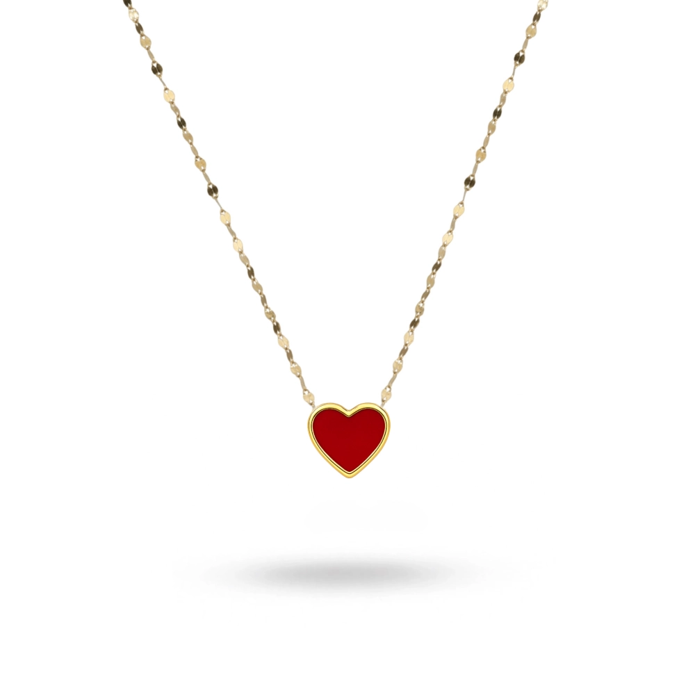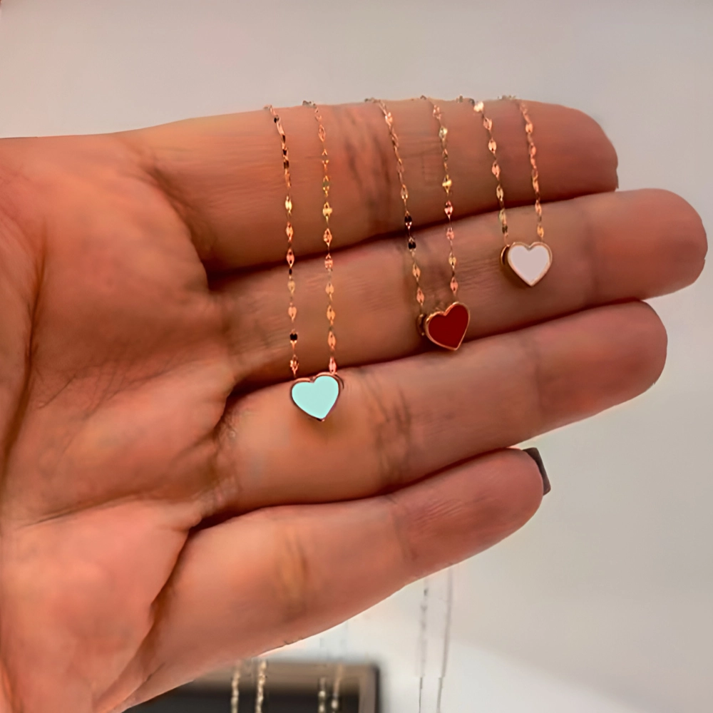 این گردنبند با طراحی ساده و در عین حال چشمنواز، از طلای ۱۸ عیار ساخته شده و پلاک قلب آن با تکنیک میناکاری ظریف و بادوام تزئین شده است. قلب این گردنبند ثابت بوده و زنجیر از میان آن عبور میکند.زنجیر این گردنبند از نوع استار پولکی است؛ زنجیری ظریف و درخشان که جلوهی بینظیری روی پوست ایجاد میکند. طول زنجیر حدود ۴۰ سانتیمتر است و بهخوبی روی گردن قرار میگیرد، بهویژه زمانی که با لباسهای یقه باز یا نیمهباز ست شود.پلاک قلب این مدل ۸ میلیمتر اندازه دارد. رنگهای مینا قابل سفارش در طیفهای جذاب شامل قرمز، سفید، زرد، آبی کمرنگ، سبز و آبی تیفانی هستند.