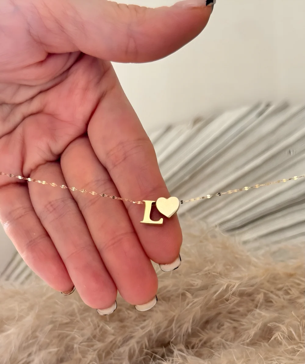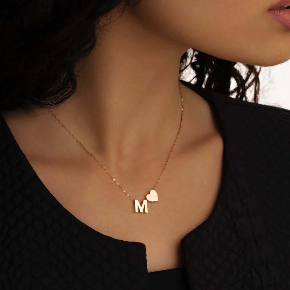 طراحی این گردنبند بسیار ظریف و مینیمال است. حروف اول اسم به صورت زیبا طراحی شده و قلب کوچک در کنار آن، جلوه ای عاشقانه به آن می بخشد.