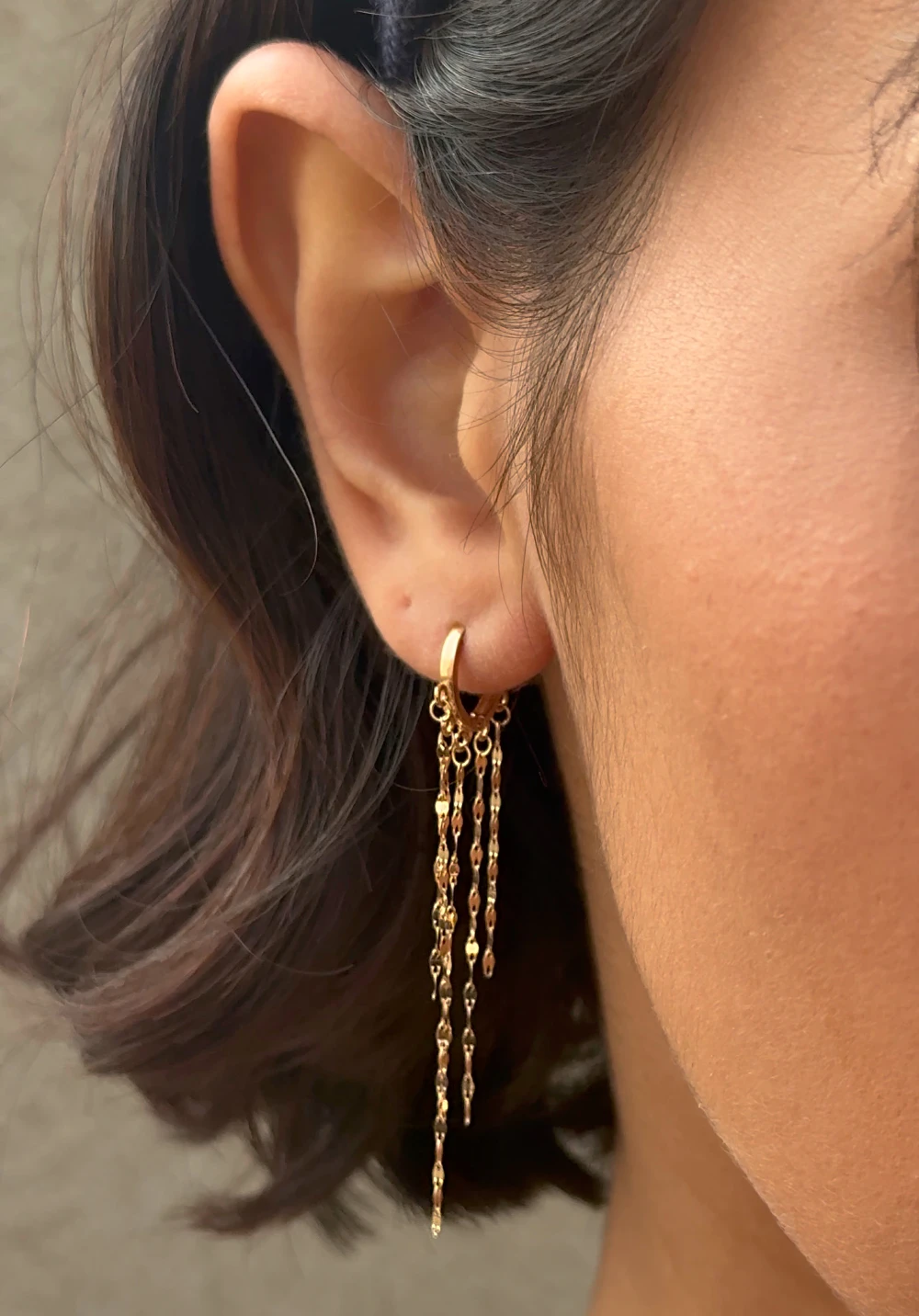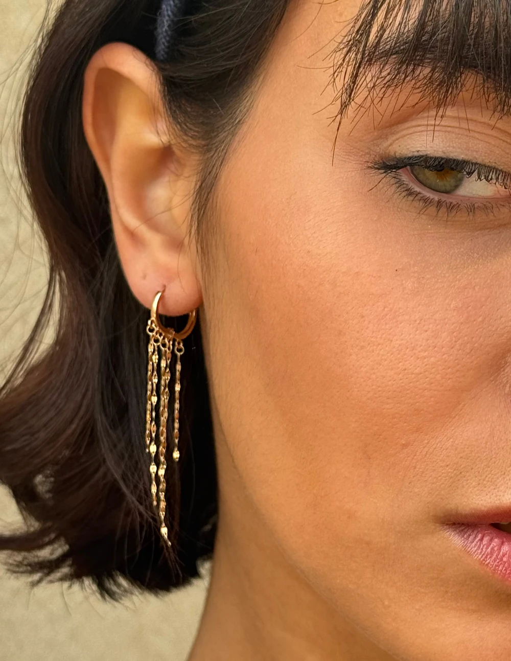 گوشواره سولین از آن مدل‌هایی است که زیبایی‌اش فقط در نگاه اول نیست؛ این گوشواره زمانی به اوج جذابیت می‌رسد که همراه با حرکت سر و بدن، رشته‌های طلایی‌اش شروع به بازی‌کردن با نور می‌کنند.