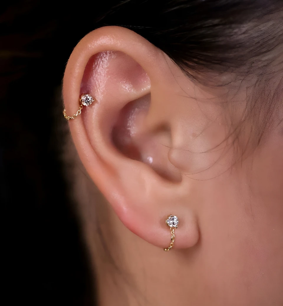 نگین این گوشواره به اندازه ۳/۵ میلیمتر بوده و به صورت مخراجکاری شده و کاملاً ایمن روی گوشواره قرار گرفته است (وزن نگین از طلا کسر شده است). این طراحی خلاقانه، حسی از حرکت و پویایی به گوشواره میدهد که آن را از مدلهای سنتی متمایز میکند. نحوه استفاده از این گوشواره ظریف به این صورت است که سیخ گوشواره را وارد سوراخ گوش کرده، حلقچه انتهای زنجیر را به داخل آن هدایت نموده و سپس با پشت گوشواره فیکس میکنید.