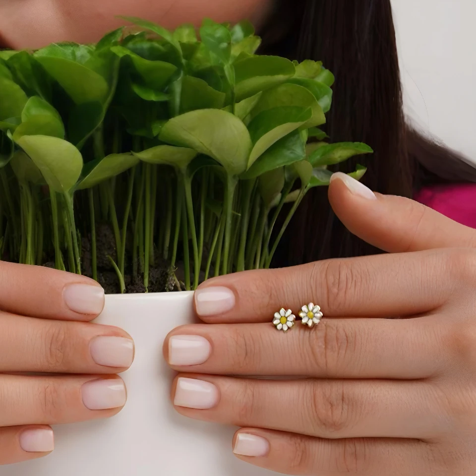 گوشواره گل بابونه طلا میناکاری شده کد 100019 از گالری نو ال، یک جفت گوشواره طلا میناکاری با طراحی مینیمال و دلنشین است که یادآور سادگی، معصومیت و پاکی طبیعت میباشد. این گوشواره طلا با الهام از گل بابونه، نماد عشق پاک و آغازهای تازه، با دقت و ظرافت به شکل یک گل کوچک ۷ میلیمتری طراحی شده است. استفاده از میناکاری فوقالعاده باکیفیت، رنگهای شاد و طبیعی سفید و زرد را به این گوشوارهها اضافه کرده که درخشش و جذابیت آنها را دوچندان نموده است (وزن مینا از طلا کسر شده است).